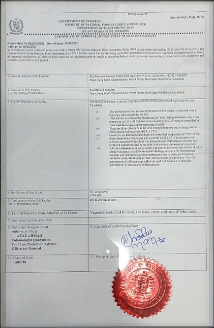 GGAS Hi-Tech Labs has successfully renewed its Post Entry Quarantine (PEQ) Station license following a comprehensive audit conducted by the Department of Plant Protection (PPD), Pakistan. The renewal reaffirms the lab’s compliance with national and international phytosanitary regulations, ensuring the safe handling and testing of imported seeds.